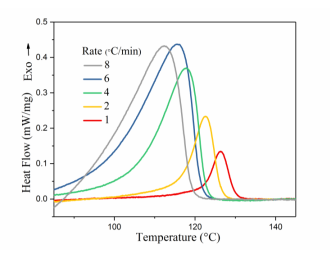 依據(jù)結(jié)晶動(dòng)力學(xué)測定標(biāo)準(zhǔn)GB/T 19466.7,利用差示掃描量熱法研究聚合物結(jié)晶動(dòng)力學(xué)。在 1、2、4、6、8°C/min 的降溫速率下,聚丙烯PP的熔體結(jié)晶 DSC 放熱曲線如圖4所示。在不同的降溫速率下,結(jié)晶峰均顯示一個(gè)單峰。隨著降溫速率的升高,結(jié)晶放熱峰呈現(xiàn)寬度逐漸變大且不斷向低溫方向偏移的趨勢。通過切線法可以獲得不同降溫速率下的結(jié)晶放熱峰峰溫 Tp 與結(jié)晶峰起始溫度 T0的值。DSC曲線幫助用戶更好地理解物質(zhì)的熱性質(zhì)和結(jié)晶行為。