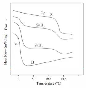 玻璃化轉(zhuǎn)變表示高分子材料從“玻璃態(tài)”轉(zhuǎn)變?yōu)椤跋鹉z態(tài)”的過程。在玻璃化溫度Tg以下,分子運(yùn)動(dòng)基本凍結(jié);到達(dá)Tg時(shí),分子運(yùn)動(dòng)活躍起來,熱容量增大,曲線向吸熱一側(cè)偏移。非晶態(tài)不相容的二元共聚物一般有兩個(gè)玻璃化轉(zhuǎn)變,而且玻璃化轉(zhuǎn)變特性有所不同。圖3是苯乙烯-丁二烯-苯乙烯(SBS)的嵌段共聚物的DSC曲線,曲線B和曲線S分別代表有一定交聯(lián)的聚丁二烯和聚苯乙烯均聚物的熱轉(zhuǎn)變曲線。共聚后的熱塑性彈性體SBS有兩個(gè)玻璃化轉(zhuǎn)變溫度Tg1和Tg2,分別向高溫側(cè)和低溫側(cè)偏移。玻璃化轉(zhuǎn)變溫度可以分析材料凝聚態(tài)結(jié)構(gòu),指導(dǎo)科學(xué)研究和工業(yè)生產(chǎn)。
