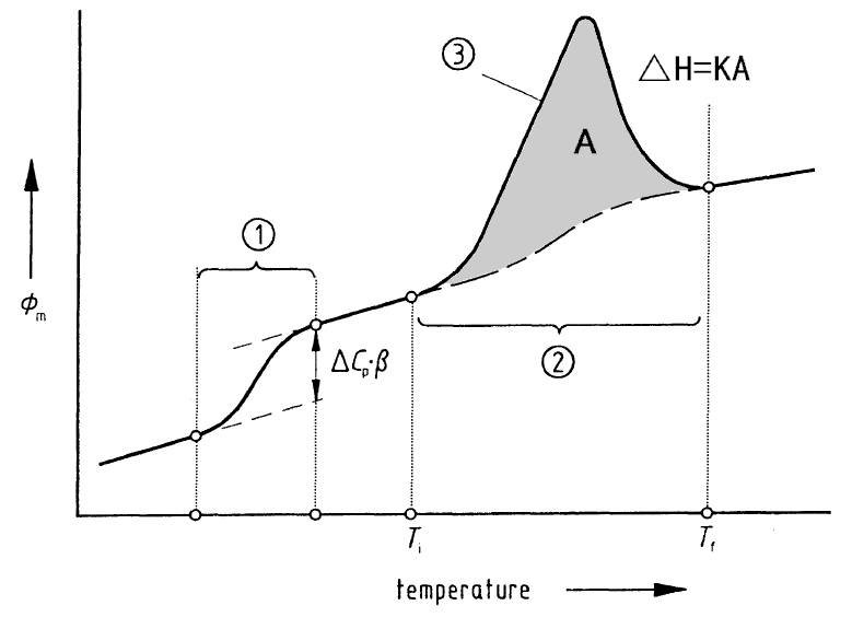 ②處虛線指的是基線?;€及峰面積的確定見下文詳解。這里的基線同樣是以臺階的形式出現(xiàn),可以認為出現(xiàn)了熱容的變化。