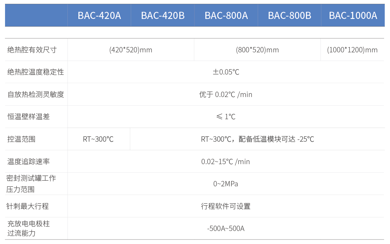 儀器性能方面,BAC系列可針對長邊≤1500mm范圍內(nèi)的電芯開展安全、精準、可靠的絕熱熱失控測試。與目前國內(nèi)外廠家的標準產(chǎn)品相比,BAC系列大容量腔體的抗爆性和產(chǎn)氣測試能力顯著提升,能夠承受大型電芯的熱失控溫壓沖擊。