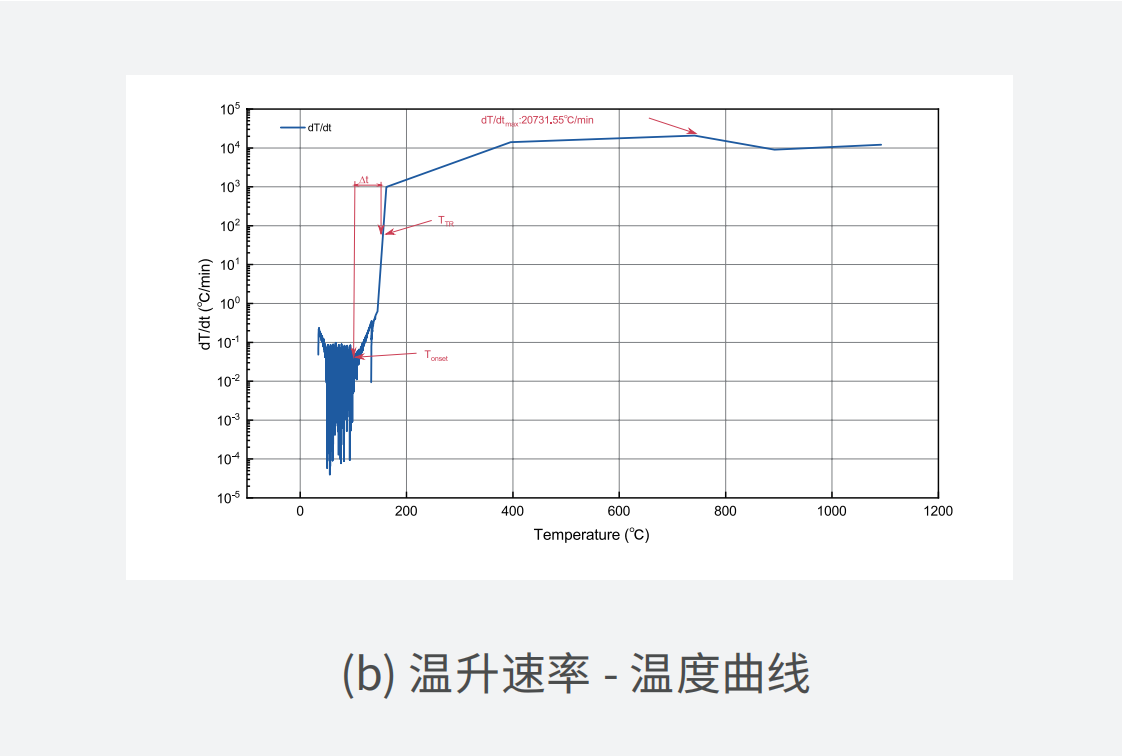 電池絕熱量熱儀(Battery Accelerating Calorimeter)在鋰電池單體熱失控測試中,能夠精準測量鋰電池的自放熱起始溫度(Tonset)、熱失控起始溫度(TTR)、熱失控最高溫度(Tmax)、泄壓溫度(Tv)、最大升溫速率((dT/dt)max)和熱失控孕育時間(?t)等關鍵參數(shù)。為電池熱管理系統(tǒng)的設計提供數(shù)據(jù)支持,助力研究人員明確鋰電池的安全邊界,實現(xiàn)熱失控的有效預防與早期預警。