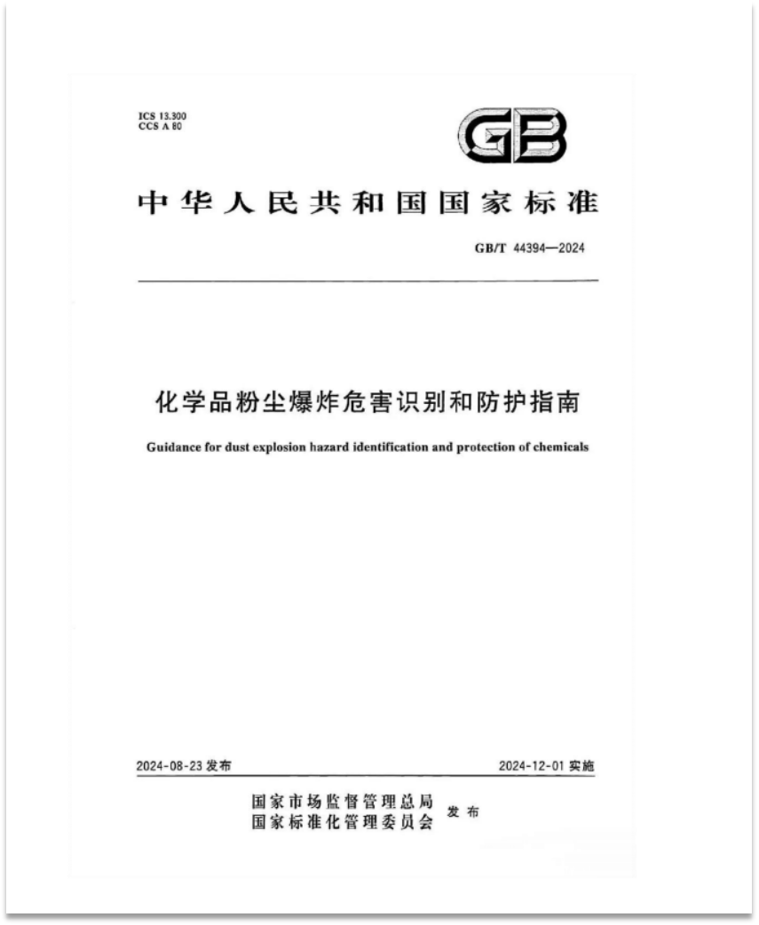 GB/T 44394-2024《化學(xué)粉塵爆炸危害識(shí)別和防護(hù)指南》將于2024年12月1日正式實(shí)施,該標(biāo)準(zhǔn)由全國(guó)危險(xiǎn)化學(xué)品管理標(biāo)準(zhǔn)化技術(shù)委員會(huì)(SAC/TC 251)制定并歸口,上?;ぴ簷z測(cè)有限公司、中國(guó)安全生產(chǎn)科學(xué)研究院、南京理工大學(xué)、上海化工研究院有限公司等多家權(quán)威機(jī)構(gòu)參與起草。