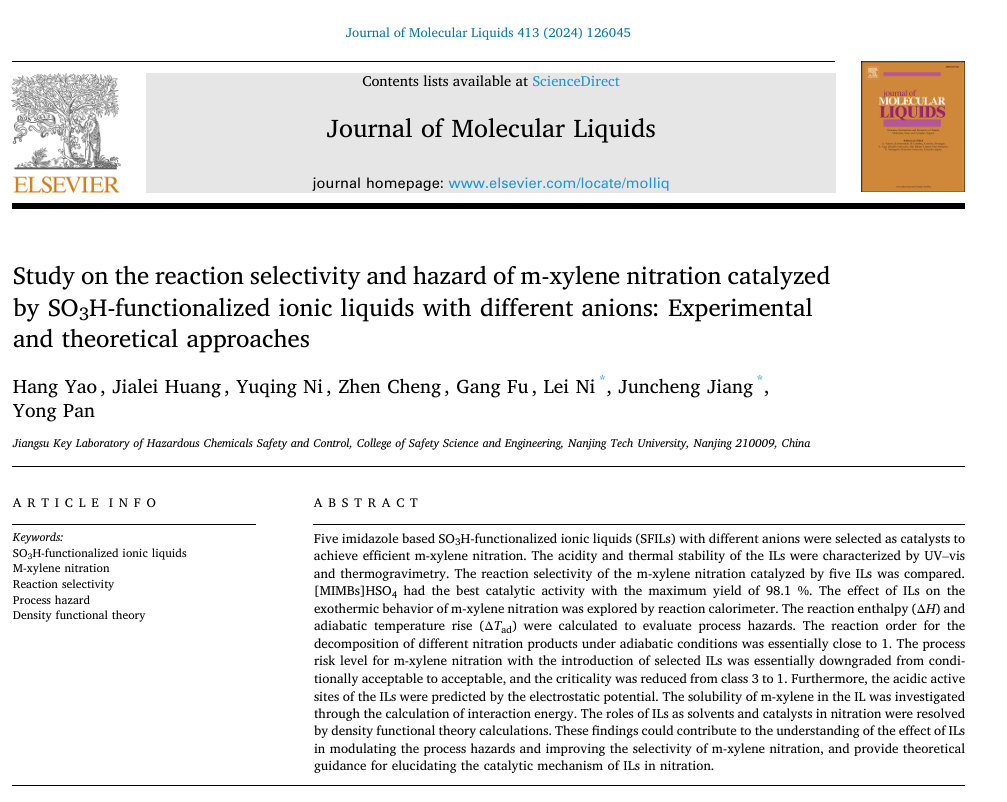 南京工業(yè)大學(xué)倪磊教授團隊在 Journal of Molecular Liquids 期刊發(fā)了表題為 Study on the reaction selectivity and hazard of m-xylene nitration catalyzed by SO3H-functionalized ionic liquids with different anions: Experimental and theoretical approaches論文,該成果由國家自然科學(xué)基金委員會(編號21927815、52334006、52274209)和江蘇省“333”項目支持。