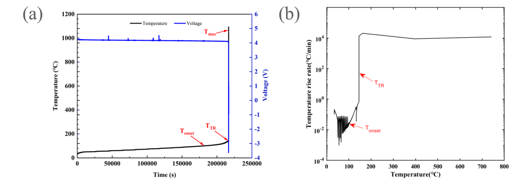 圖2 190Ah電池?zé)崾Э?a)溫升/電壓-時(shí)間曲線和(b)溫升速率-溫度曲線