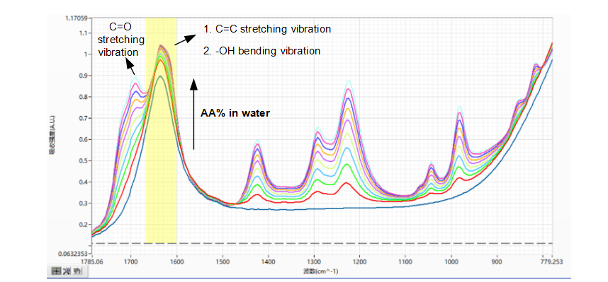 原位衰減全反射傅里葉變換紅外光譜(in-situ ATR-FTIR)目前已成功應用于自由基聚合、陰離子聚合和陽離子聚合等聚合反應研究,主要通過測定反應過程中碳碳雙鍵等特征基團的吸光度變化建立定量模型,計算單體濃度和轉(zhuǎn)化率[1,5,6]。然而該方法并不適用于半間歇式水相聚合體系,以聚丙烯酸(PAA)的水相溶液聚合反應為例,為控制反應平穩(wěn)進行,工業(yè)生產(chǎn)中通常會將部分丙烯酸單體、引發(fā)劑和鏈轉(zhuǎn)移劑溶液同時以滴加方式投入聚合釜內(nèi)。如圖1所示,水中的羥基在1650 cm-1附近的紅外吸收峰強度較大,而碳碳雙鍵在臨近位置的吸收峰相對較弱,由于半間歇反應過程中水的濃度也會相應變化,將水的純譜作為背景直接進行扣除將顯著影響單體紅外定量的準確性。