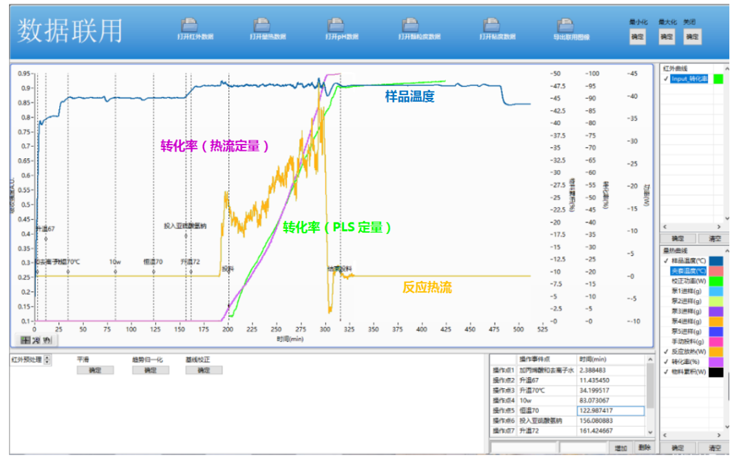 計算不同時刻PAA濃度與總濃度的比值可以得到丙烯酸單體轉(zhuǎn)化率曲線,單體的最終轉(zhuǎn)化率為92.3%。另外,利用ICPA平臺的在線量熱功能可以表征半間歇聚合反應的實時放熱情況,放熱熱流曲線間接反映了聚合速率變化。同時,通過計算累計的放熱量也可以得到反應轉(zhuǎn)化率曲線,本質(zhì)上該曲線體現(xiàn)了聚合反應完成度變化,同樣可以表現(xiàn)反應的動力學特征。如圖4所示,通過數(shù)據(jù)聯(lián)用,可以發(fā)現(xiàn)紅外定量與量熱得到的反應轉(zhuǎn)化率曲線趨勢基本一致,可以相互印證上述兩種ICPA技術(shù)對于本案例動力學研究的適用性與準確性。除水相溶液聚合反應外,本文介紹的方法同樣適用于其他水相反應體系,可降低或消除水對目標物質(zhì)定量分析的干擾。