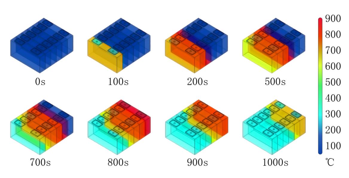 圖1 方形電池模組(簡(jiǎn)化)溫度變化過程CFD仿真