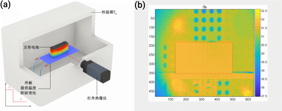 圖3 (a)測(cè)量系統(tǒng)結(jié)構(gòu)示意圖; (b)電池最大面溫度場(chǎng)演變過程示意圖