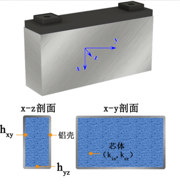 為了在不改變電池傳熱規(guī)律的前提下簡(jiǎn)化計(jì)算,如圖2所示,可將方形電池簡(jiǎn)化為金屬外殼和內(nèi)部芯片兩部分組成的非均質(zhì)等效模型。其中芯體熱特性為正交各向異性;殼體為均質(zhì),且已知其熱物性參數(shù)。