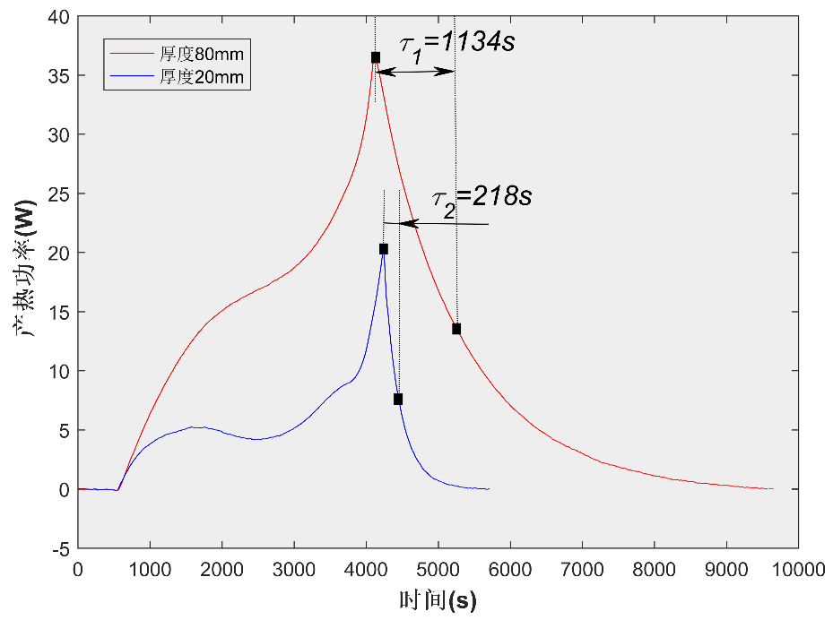 由于厚度不同的電池在容量上難以一致,因此本文選用兩款容量不同、大面面積相似、而厚度分別為20mm和80mm的磷酸鐵鋰電池(#1和#2),進(jìn)行1C恒流放電實(shí)驗(yàn)。理論上放電過(guò)程中電池內(nèi)阻隨SOC下降而單調(diào)遞增,所以放電結(jié)束時(shí)刻電池產(chǎn)熱功率應(yīng)達(dá)到最大值。但等溫量熱儀測(cè)量存在的熱滯后效應(yīng)導(dǎo)致放電結(jié)束后熱功率曲線需要經(jīng)過(guò)一定時(shí)間才能衰減為零。此處定義放電結(jié)束后功率從峰值衰減至峰值1/e的時(shí)間τ為熱滯后時(shí)間常數(shù)。τ的大小與電池至加熱片之間非穩(wěn)態(tài)傳熱的時(shí)間常數(shù)相關(guān)。如圖2所示,對(duì)于厚度為80mm的#2電池,τ?=1134,明顯大于#1電池的計(jì)算結(jié)果(τ?=218),說(shuō)明電池厚度增加會(huì)顯著影響電池產(chǎn)熱測(cè)量的動(dòng)態(tài)響應(yīng),這可能是由于電池?zé)崛莺蛢?nèi)部熱阻都與厚度正相關(guān)。