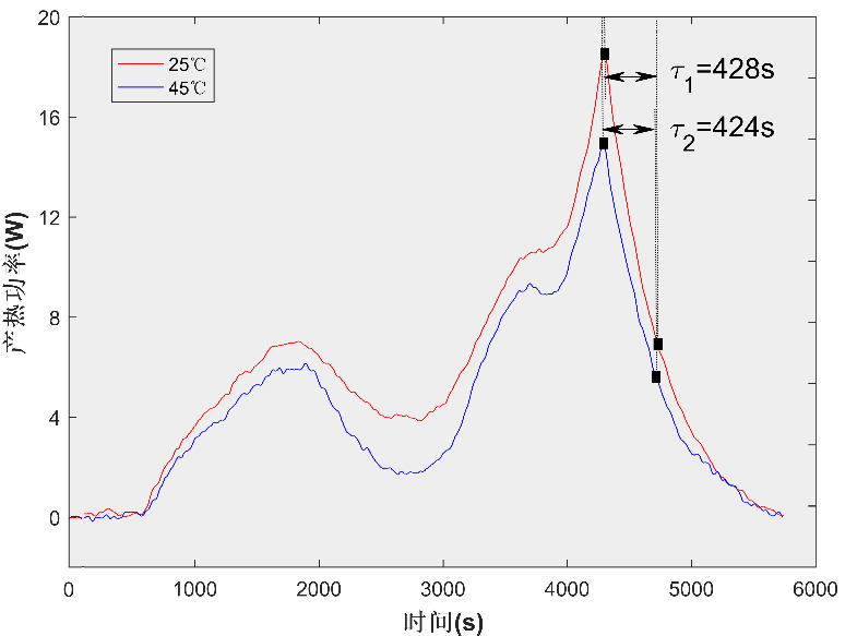 不同工作溫度下電池產(chǎn)熱特性存在差異。如圖4,在45℃條件下#3電池產(chǎn)熱功率略小于25℃下的結(jié)果,但兩者的熱滯后時(shí)間常數(shù)基本一致。可以初步認(rèn)為溫度與熱滯后沒(méi)有明顯關(guān)聯(lián)性,這可能是由于溫度小幅度變化對(duì)系統(tǒng)傳熱特性幾乎沒(méi)有影響。