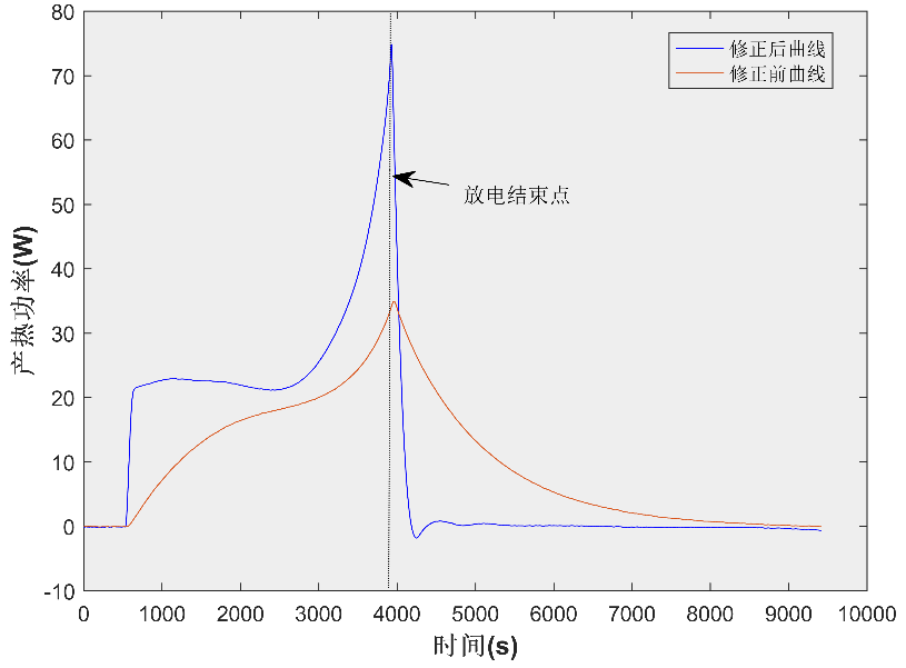 修正前后的產(chǎn)熱功率曲線如圖5所示,可以發(fā)現(xiàn)修正后的曲線幾乎消除了放電結(jié)束后的功率衰減時(shí)間,能夠更好地反映電池瞬態(tài)產(chǎn)熱特性。