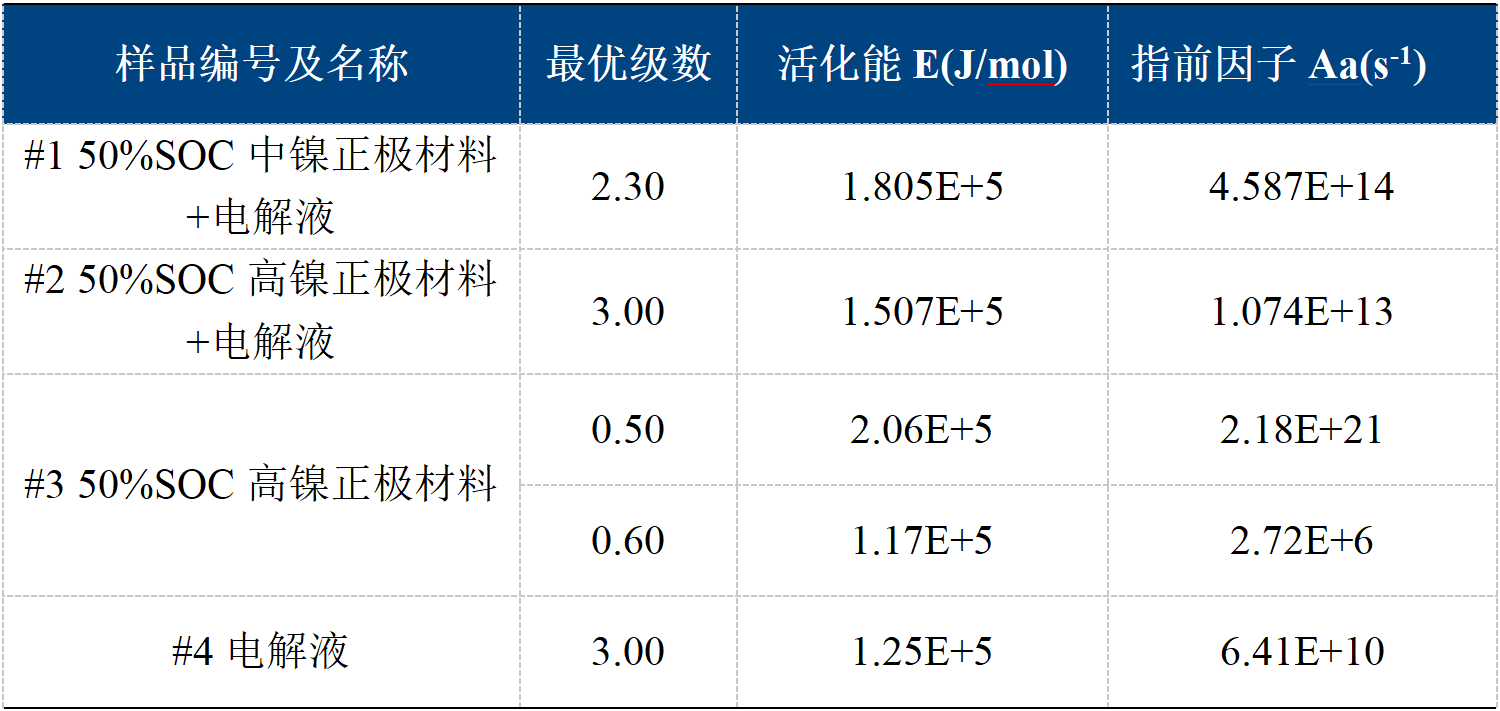 本文利用絕熱加速量熱儀經(jīng)典的HWS模式測(cè)定了電池材料的熱分解反應(yīng)特征參數(shù),并基于阿倫尼烏斯方程擬合得到了反應(yīng)動(dòng)力學(xué)參數(shù)。相關(guān)結(jié)果有助于電池設(shè)計(jì)和系統(tǒng)熱仿真,改進(jìn)電池系統(tǒng)的熱安全性能。