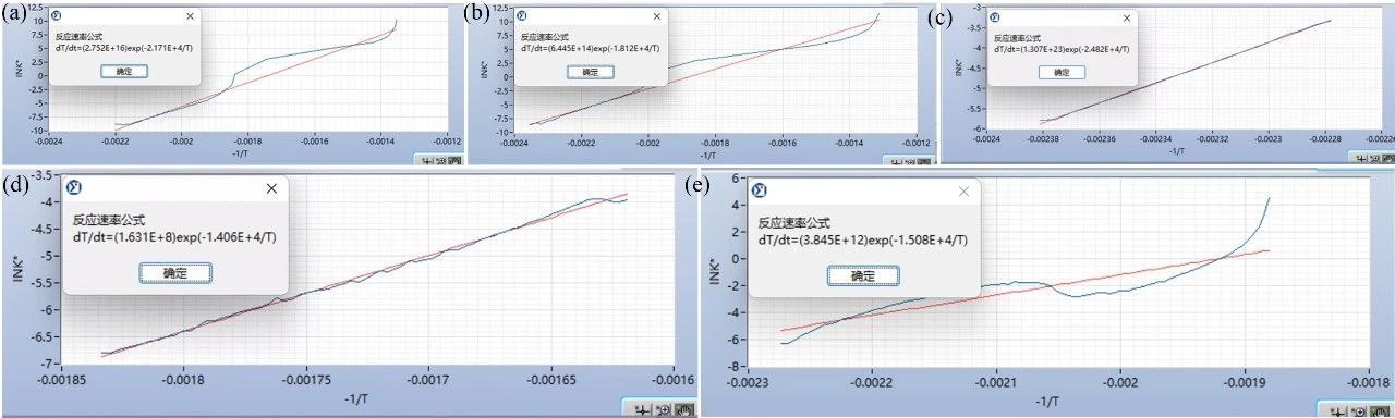 圖5 (a) 50%SOC中鎳正極材料&電解液混合物、(b) 50%SOC高鎳正極材料&電解液混合物、(c,d) 50%SOC高鎳正極材料以及(e) 電解液的熱分解反應(yīng)動(dòng)力學(xué)擬合結(jié)果
