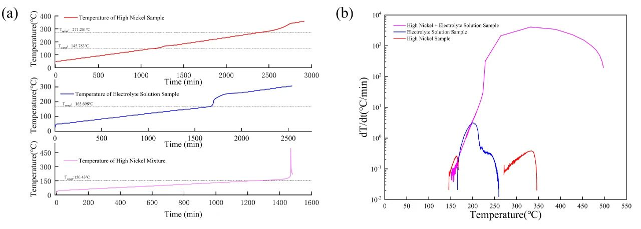 圖3 高鎳正極材料、電解液及兩者混合物的HWS(a)溫升曲線和(b)溫升速率-溫度曲線