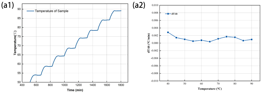 由于量熱腔內(nèi)可能存在微小的溫度分布,為防止絕熱追蹤階段量熱腔壁面對樣品產(chǎn)生過加熱或欠加熱,確保腔內(nèi)精密的絕熱環(huán)境,需利用與電池同尺寸的鋁質(zhì)標準塊作為電池等容物,利用儀器的“溫差基線”模式對爐壁-樣品溫差的溫度依賴性進行校準;該步驟的實驗要點如下: