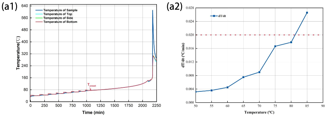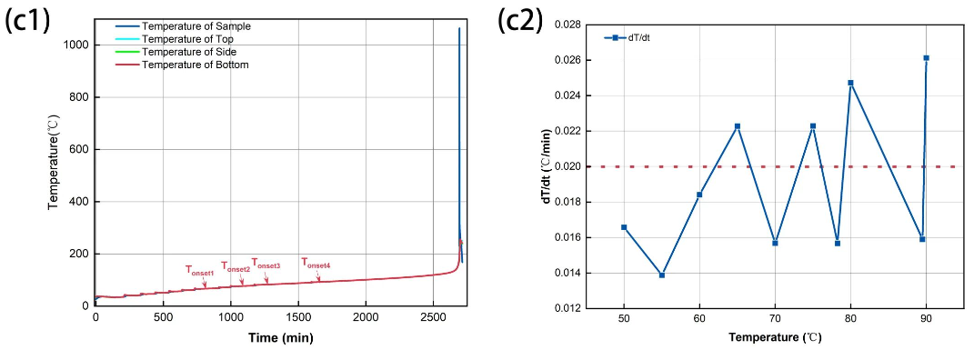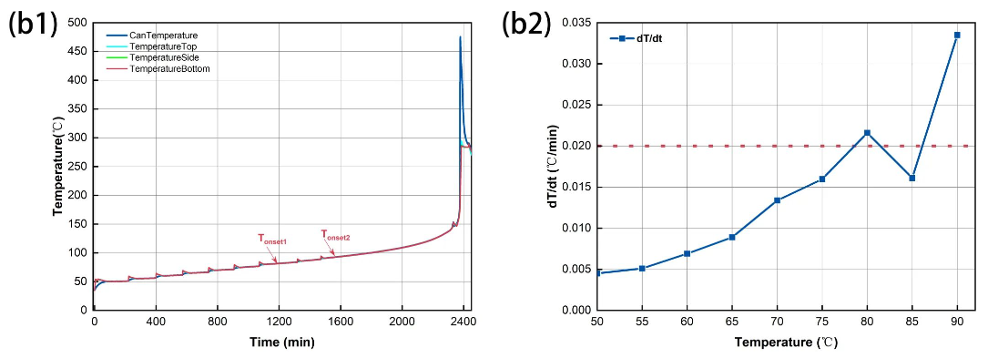3) 只存在一個Tonset溫度。圖7b出現(xiàn)2個Tonset,上述現(xiàn)象有一定概率會發(fā)生,可能與SEI膜分解和再生的動態(tài)平衡有關(guān),但更可能是校準文件不理想帶來的結(jié)果;圖7c使用圖4c的校準文件進行測試,相鄰臺階的溫升速率無規(guī)波動,可能出現(xiàn)多次檢出Tonset的反常結(jié)果。