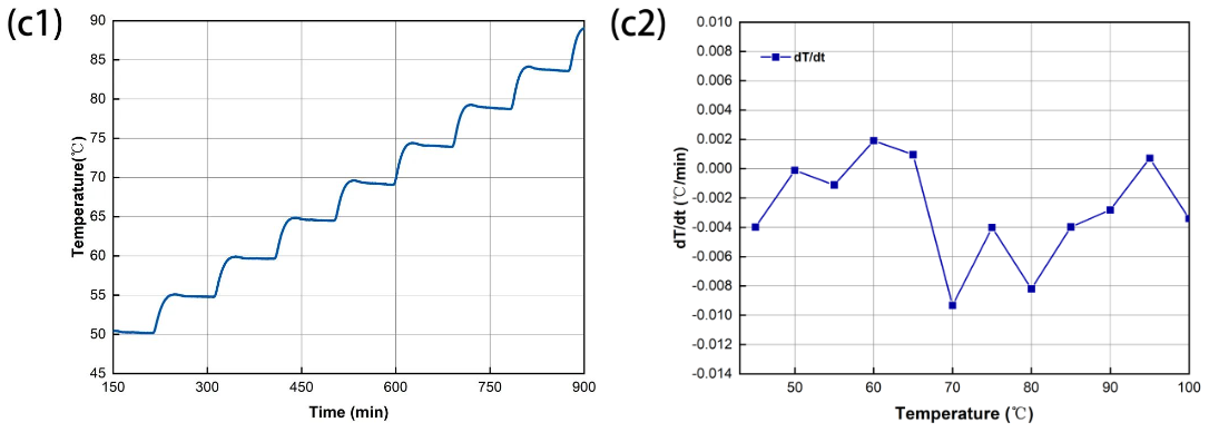 (1) 校準文件合格性判據(jù)統(tǒng)計每個臺階達到溫度平衡階段后鋁塊的溫升速率。如圖4a所示,若各臺階的溫升速率均處于一個遠小于檢測閾值的區(qū)間內(nèi),可判定校準文件合格,說明試樣處于相對嚴格的絕熱環(huán)境中,在0.02℃/min的檢測閾值條件下可準確進行電池Tonset點判定,出現(xiàn)誤判或明顯偏差的可能性低。而如圖4b和圖4c所示,均為不合格的情況。圖4b鋁塊各臺階的溫升速率過大,說明壁面對試樣存在過加熱的情況,進行電池實驗時可能導(dǎo)致Tonset點在電池未開始自放熱階段被提前檢出。該情況下,需要通過延長恒溫時間等方式重新進行溫差基線校準;圖4c對應(yīng)的樣品尺寸很小、熱慣量過低,因此爐腔內(nèi)微弱的溫度場擾動導(dǎo)致樣品溫升速率劇烈波動,進行電池實驗時發(fā)生Tonset誤檢測概率高。上述情況建議更換適用于小電芯檢測的儀器進行測試。