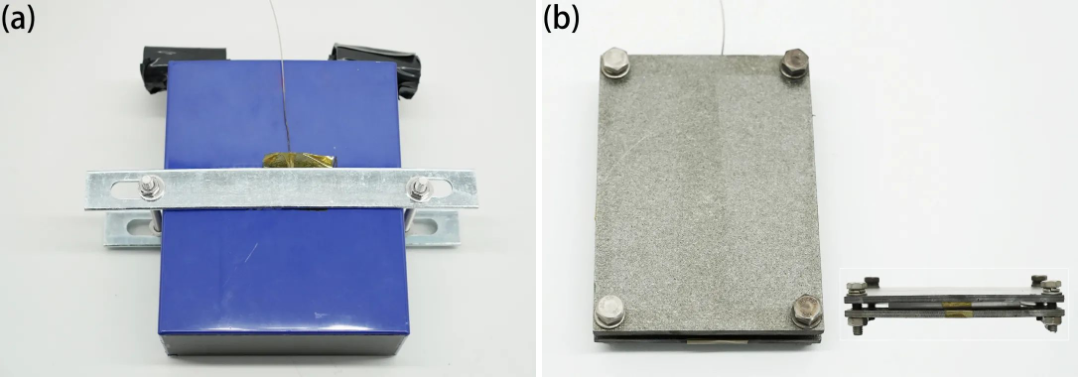 4) 使用低Phi值的夾具對樣品熱電偶進行固定和壓緊。目前常用的夾具有金屬肋條(圖5a)和云母板(如圖5b)等。云母板對電池施加的應(yīng)力更均勻,但導(dǎo)熱性較差,需要設(shè)置更長的恒溫時間使樣品溫度達到平衡。