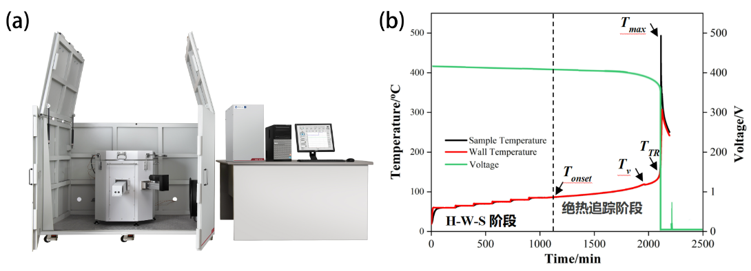 圖1 (a)BAC-420A大型電池絕熱量熱儀與(b)電池絕熱熱失控典型數(shù)據(jù)