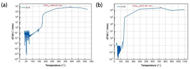 根據(jù)測試數(shù)據(jù),9系三元鋰電池自放熱起始溫度Tonset為86.78度,熱失控起始溫度TTR為202.76度,電池電壓的驟降點(diǎn)與TTR溫度基本一致。電池到達(dá)TTR之后具有極高的溫升速率,2s內(nèi)電池表面溫度達(dá)到熱失控最高溫度1109℃,最大升溫速率約為48900℃/min。與9系鋰電池相比,如圖2所示,6系電池從TTR到達(dá)Tmax需要70s,最大升溫速率約為6500℃/min;8系電池需要5s,最大升溫速率約為20600℃/min,說明隨著鎳含量的上升,電池?zé)崾Э貏×页潭炔粩嗵岣摺?