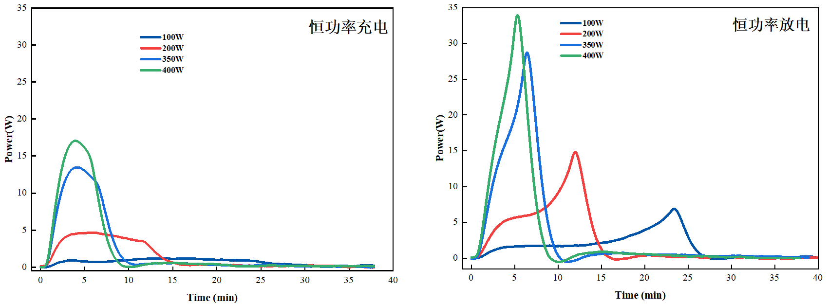 圖5 鋰離子電容器恒功率充電(左)和恒功率放電(右)放熱功率曲線