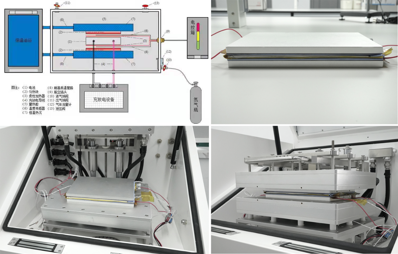 Step1:打開等溫量熱儀蓋板,至下向上依次安裝勻熱塊-加熱片-導(dǎo)熱硅脂墊-電池樣品-導(dǎo)熱硅脂墊-加熱片-勻熱塊,如圖2,保證各部件之間不產(chǎn)生間隙;