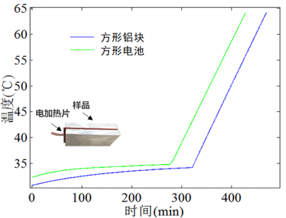 比熱容測試基于差示絕熱追蹤的原理。簡而言之,在量熱儀的絕熱追蹤工作模式下,利用柔性電加熱片對鋰電池與已知比熱容的標(biāo)準(zhǔn)樣品(通常為鋁質(zhì))進(jìn)行加熱,并盡量控制樣品與參比的升溫歷程一致。根據(jù)式(1)和式(2),利用參比可計(jì)算和扣除由于測試過程中實(shí)驗(yàn)環(huán)境難以達(dá)到完全理想絕熱而耗散至環(huán)境中的熱量,從而精確測量鋰電池比熱容。
