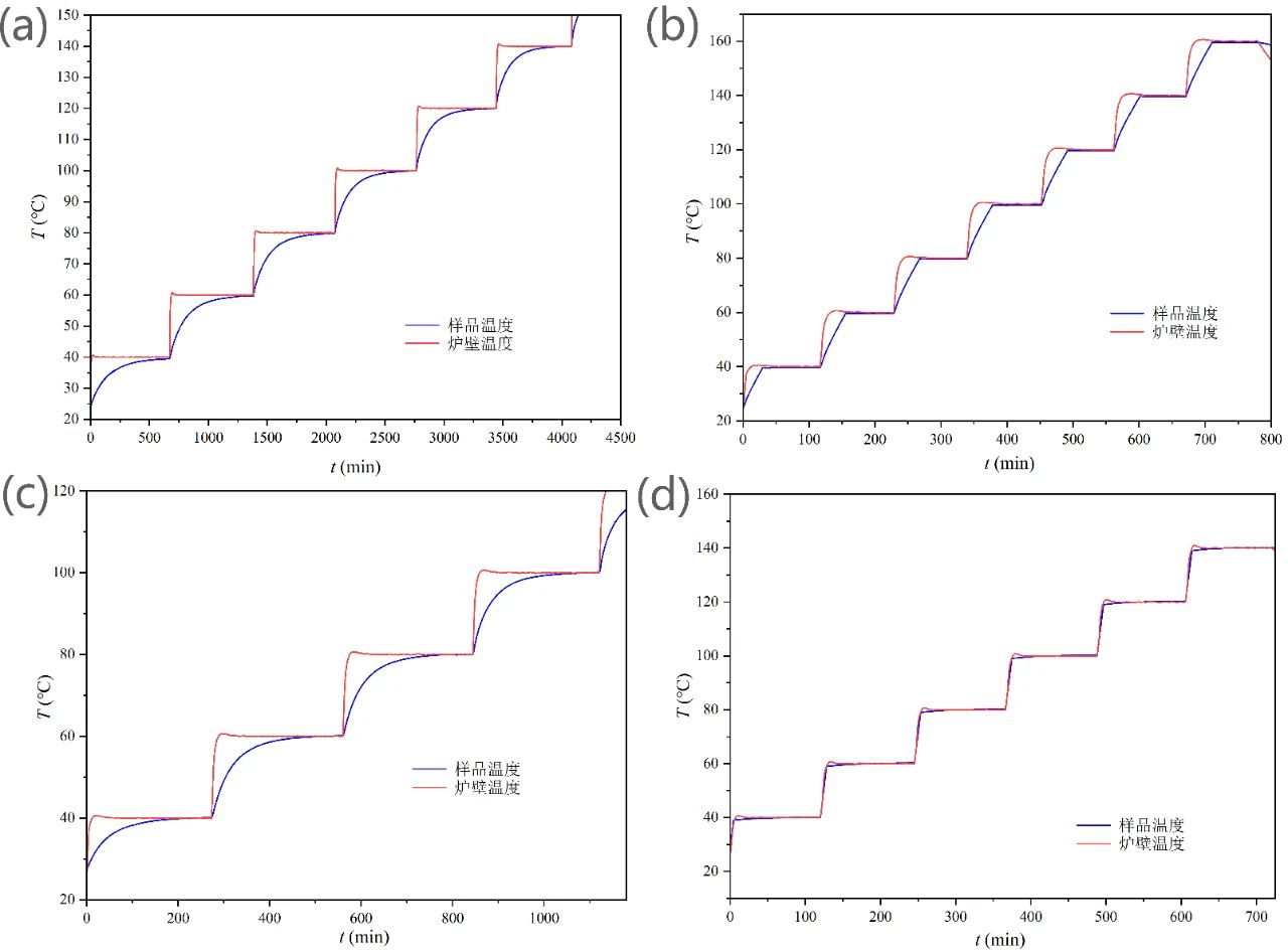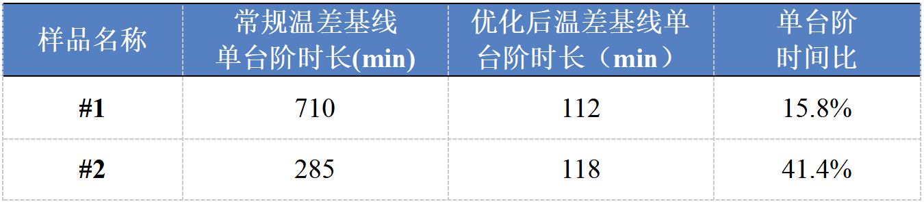 根據(jù)表1,優(yōu)化后1號和2號樣品溫升曲線的單臺階時(shí)間僅為優(yōu)化前的15.8%和41.4%,對于大質(zhì)量的樣品提升效果尤為顯著。在優(yōu)化后,兩個(gè)樣品的單臺階時(shí)長均為110min~120min,而一般溫差基線實(shí)驗(yàn)需要跑6~10個(gè)臺階,因此大部分樣品均可在1天內(nèi)完成實(shí)驗(yàn),大幅提高了溫差基線實(shí)驗(yàn)的效率。