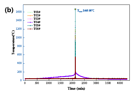 圖2 三元九系電池熱失控(a)溫度&電壓-時間曲線、溫升速率-溫度曲線和(b)附加熱電偶溫度-時間曲線