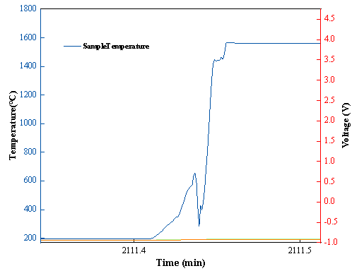 對圖2溫度數(shù)據(jù)及圖3產(chǎn)氣速率、產(chǎn)氣量數(shù)據(jù)進行分析后發(fā)現(xiàn),該電池熱失控十分劇烈,并且放大樣品溫度曲線可以發(fā)現(xiàn),整個熱失控過程從開始到結(jié)束持續(xù)不到3s,就完成了1300℃以上的溫升,溫升速率達到了200000℃/min以上。同時,觀察氣體數(shù)據(jù)可以發(fā)現(xiàn),在熱失控過程中最大產(chǎn)氣速率達到15000L/min以上,展現(xiàn)了鋰電池燃爆時極強的沖擊力。
