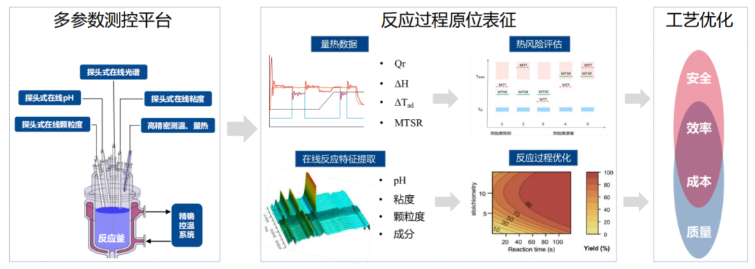 在上文提到的原料藥開發(fā)過程中,如果我們能夠在合成反應(yīng)過程中對反應(yīng)特征參數(shù)進(jìn)行實(shí)時監(jiān)測無疑能夠幫助研究人員更快、更好地進(jìn)行工藝開發(fā)和優(yōu)化。原位表征和過程分析(ICPA)平臺集成了功能強(qiáng)大的原位、實(shí)時測試能力。例如,可以通過在線分子光譜儀實(shí)時分析反應(yīng)體系的組分信息及含量變化;可以利用在線粘度計、在線顆粒度、在線PH計等儀器測定體系粘度、顆粒度和PH值等參數(shù)變化;利用反應(yīng)量熱儀測定反應(yīng)放熱速率、絕熱溫升、物料累積等熱安全數(shù)據(jù)。上述測試手段和數(shù)據(jù)將幫助試驗(yàn)人員進(jìn)行反應(yīng)過程分析、機(jī)理研究和風(fēng)險評估,并從安全、質(zhì)量、成本等維度快速、高效地進(jìn)行原料藥合成工藝優(yōu)化。
