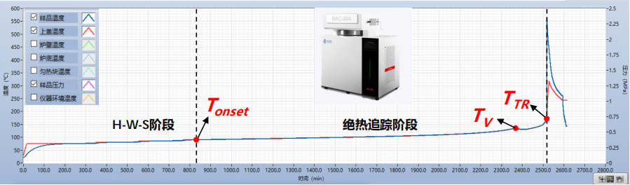 以18650電池為例,可利用小型電池絕熱量熱儀進(jìn)行測試。利用儀器的H-W-S工作模式進(jìn)行熱失控實(shí)驗(yàn),可以得到如圖3所示的電池?zé)崾Э販厣€。曲線前半部分為“H-W-S” 模式,儀器將通過外部加熱實(shí)現(xiàn)電池臺階式升溫,并重復(fù)進(jìn)行加熱-等待-搜尋過程,直至檢測到鋰電池開始自放熱。隨后儀器將自動跳轉(zhuǎn)為“絕熱追蹤”模式,電加熱系統(tǒng)將控制電池周圍的環(huán)境溫度緊跟電池溫度變化,確保電池產(chǎn)熱完全用于升高自身溫度。通過鋰電池?zé)崾Э厍€,我們可以對其中一些特殊的溫度點(diǎn)進(jìn)行測定和分析,評估電池的熱安全性能。例如,Tonset是鋰電池自放熱起始溫度,電池自產(chǎn)熱速率高于0.02 ℃/min,可以認(rèn)為該溫度下SEI膜開始分解。高于此溫度,電池將出現(xiàn)明顯的自產(chǎn)熱;而TTR是熱失控引發(fā)溫度,一般定義為電池的自產(chǎn)熱速率高于1℃/s 的溫度。在此溫度后,電池將出現(xiàn)劇烈溫升,溫升速率可能高達(dá)105 ℃/min,同時(shí)一般會伴隨產(chǎn)生大量的光和熱;Tmax是鋰電池?zé)崾Э剡^程能達(dá)到的最高溫度。