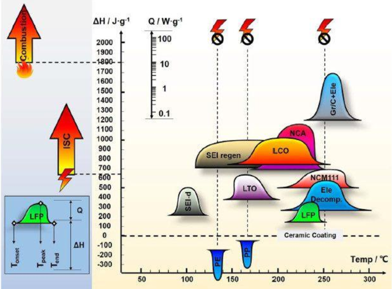 (1)自反應(yīng)放熱階段:由于內(nèi)部短路,外部加熱或者電池自身在大電流充放電時(shí)自身發(fā)熱,使得電池內(nèi)部溫度上升至90~100℃左右,SEI膜開始收縮分解,正負(fù)極材料與電解質(zhì)發(fā)生接觸,負(fù)極開始與電解液反應(yīng),放出熱量進(jìn)一步提高溫度;