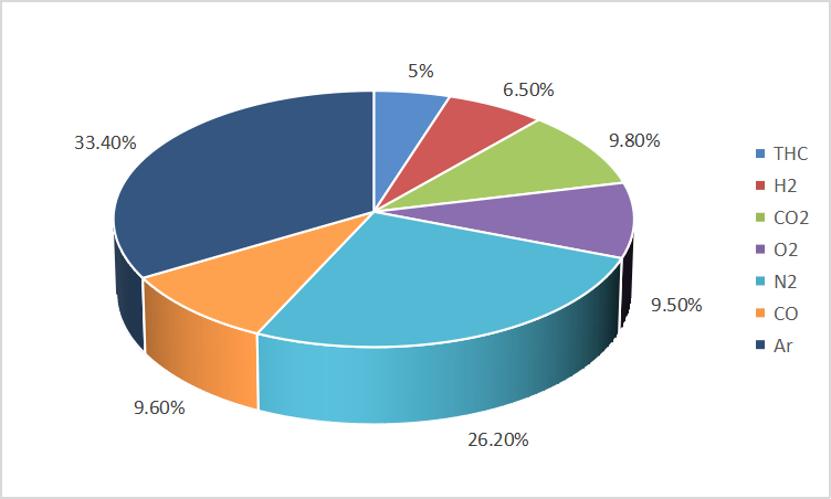 在本案例中,采用國內(nèi)某廠家50A·h、100%SOC的三元鋰電池,使用大型電池絕熱量熱儀(仰儀科技BAC-420A型)在惰性氣體氛圍中完成電池?zé)崾Э貙嶒灐kS后對電池產(chǎn)氣進行收集,并利用氣相色譜對氣體成分進行分析,結(jié)果如下圖所示: