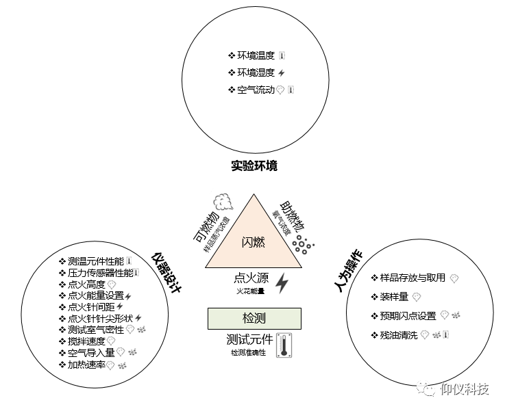 可燃液體處于閃點時,液面附近的蒸氣濃度就是爆炸下限濃度(CLFL)。對于閉口閃點測試,測試過程中樣品蒸氣濃度累積至CLFL是一個復(fù)雜的非線性、多因素耦合的過程,是液體蒸發(fā)、氣體擴散、自然對流、強制對流、氣體氧化和燃燒等效應(yīng)持續(xù)或間歇作用累加的結(jié)果。另一方面,閃點測試結(jié)果又取決于蒸氣引燃效果與燃爆增壓檢測能力。以ASTM D6450和ASTM D7094的測試方法為例,圖2總結(jié)了可能影響閃點的各種因素,主要可分為儀器設(shè)計、實驗環(huán)境和人為操作三方面因素。