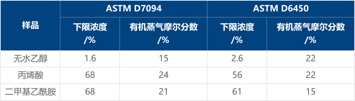 另外,ASTM D6450 和 ASTM D7094 兩種方法對于單一濃度閃點值的測試結果呈現(xiàn)較高的一致性,但在樣品量、加熱速率、空氣導入量等方面的差異導致測定的濃度下限存在一定區(qū)別(見圖 2 和表 1)。由于測試流程中蒸氣濃度累積至 LFL 是一個復雜的非線性、多因素耦合過程,濃度下限與檢測方法之間并沒有體現(xiàn)出很好的規(guī)律性。