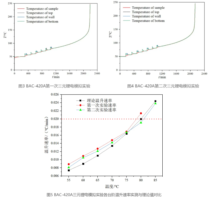 對(duì)于磷酸鐵鋰模擬實(shí)驗(yàn),標(biāo)樣的理論Tonset溫度為106.7℃,兩次實(shí)驗(yàn)的Tonset檢出臺(tái)階均為110℃,符合預(yù)期。上述實(shí)驗(yàn)結(jié)果均滿(mǎn)足一個(gè)臺(tái)階步長(zhǎng)(5℃)的誤差范圍。實(shí)驗(yàn)中各臺(tái)階實(shí)測(cè)溫升速率與理論值偏差均在±0.003℃/min內(nèi)。