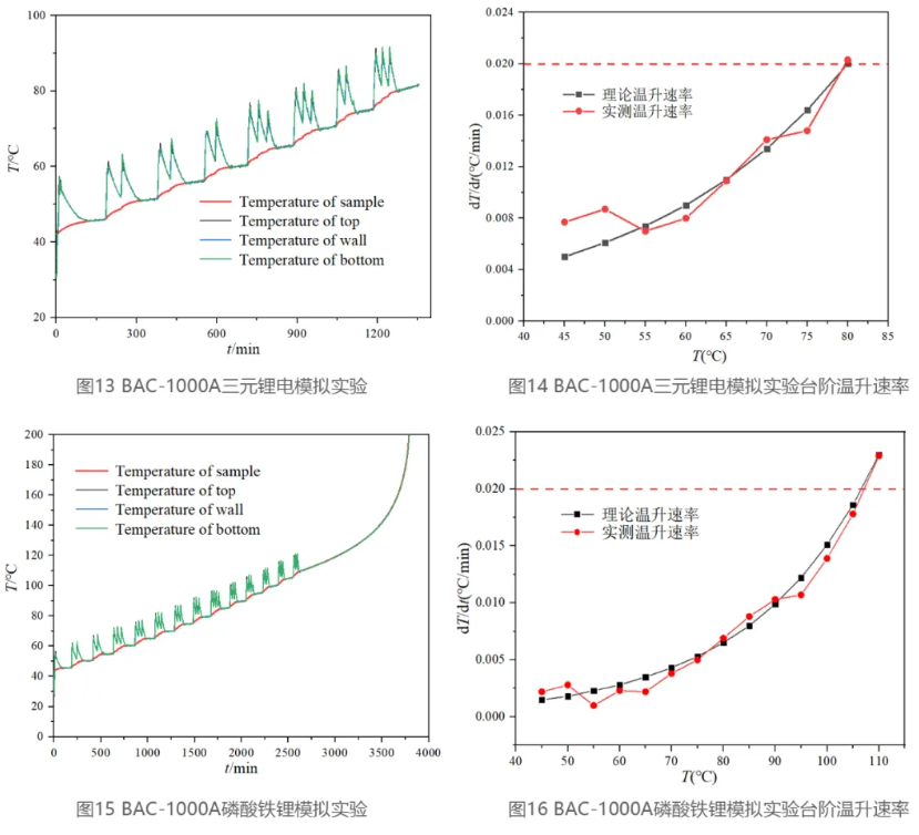 對(duì)大尺寸密閉型絕熱量熱儀BAC-1000A分別進(jìn)行一組三元鋰電和磷酸鐵鋰的絕熱熱失控模擬實(shí)驗(yàn),實(shí)驗(yàn)結(jié)果如圖13~圖16所示。三元鋰電、磷酸鐵鋰模擬實(shí)驗(yàn)的Tonset檢出臺(tái)階分別為80℃、110℃,均符合預(yù)期;實(shí)驗(yàn)中各臺(tái)階實(shí)測(cè)溫升速率與理論值偏差均在±0.005℃/min內(nèi)。