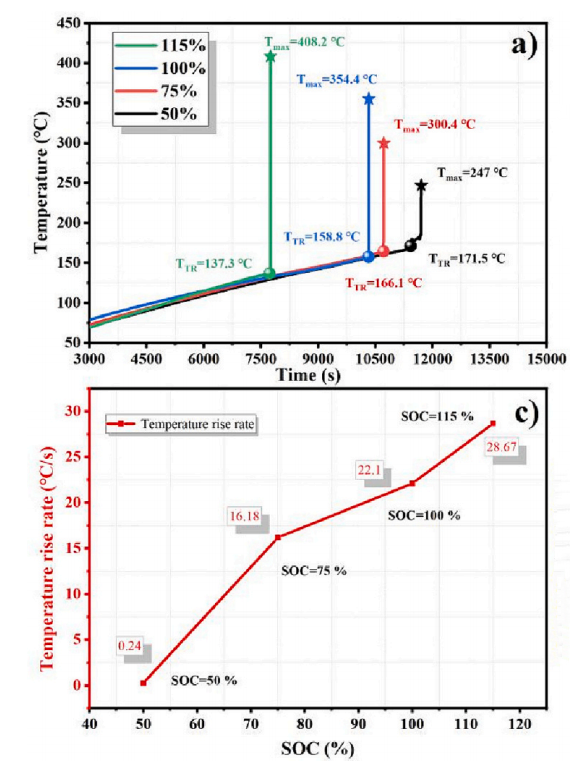如下圖3所示,隨著電池SOC的上升,TTR單調(diào)下降,而Tmax及(dT/dt)max則單調(diào)上升。說明隨著SOC的上升,電池熱失控能夠在更低的溫度下發(fā)生,同時電池熱失控瞬間釋放的能量增大。即隨著電量增大,電池熱穩(wěn)定性下降,熱失控更易于發(fā)生,同時熱失控劇烈程度更高,具有更大的熱危害性。