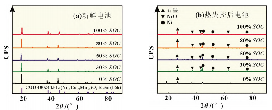 以上研究說明高電量更容易導致電池熱失控的發(fā)生,且熱失控劇烈程度會更高、燃爆現(xiàn)象更明顯。上?;ぱ芯吭簝Φ马g等[3]研究認為正極材料的熱分解是電池熱失控的重要步驟,也是導致高電量電芯更易失控的原因之一,為此他們使用了XRD對熱失控前后正極材料的晶體結(jié)構(gòu)進行了分析。