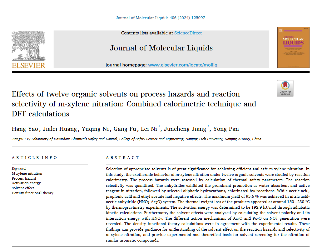 南京工業(yè)大學(xué)倪磊教授團(tuán)隊(duì)在Journal of Molecular Liquids期刊發(fā)表論文《Effects of twelve organic solvents on process hazards and reaction selectivity of m-xylene nitration: Combined calorimetric technique and DFT calculations》,該成果由國家自然科學(xué)基金項(xiàng)目(No. 21927815, 52334006, 52274209)等支持。