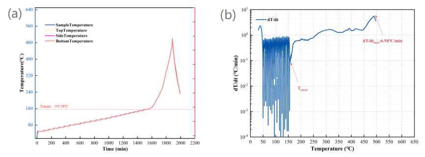 圖4 1號電池(a)熱失控溫升和(b)溫升速率-溫度曲線