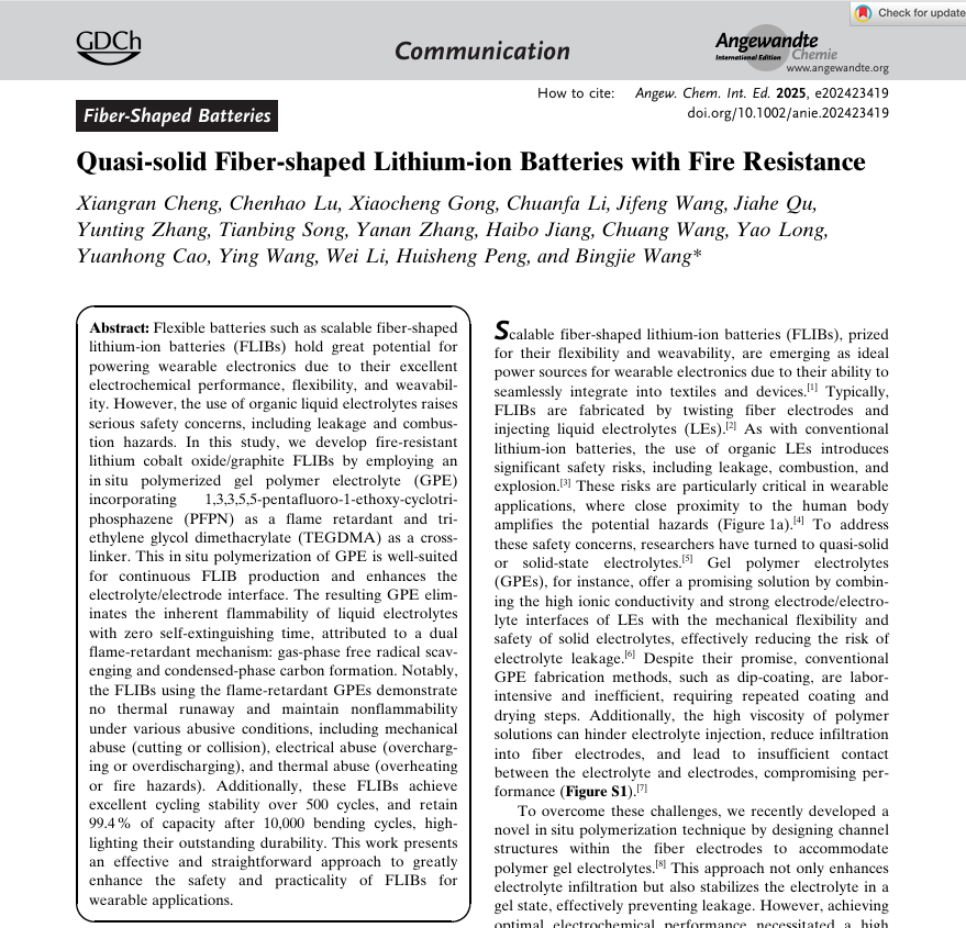 本研究運(yùn)用仰儀科技的小型電池絕熱量熱儀BAC-90A,針對復(fù)旦大學(xué)王兵杰團(tuán)隊(duì)研發(fā)的新型纖維聚合物鋰離子電池開展熱失控測試,深入剖析了該纖維電池的熱安全性。相關(guān)研究成果《Quasi - solid Fiber - shaped Lithium - ion Batteries with Fire Resistance》已發(fā)表于《Angewandte Chemie》期刊,為該電池在智能可穿戴設(shè)備等領(lǐng)域的應(yīng)用夯實(shí)了理論基礎(chǔ)。