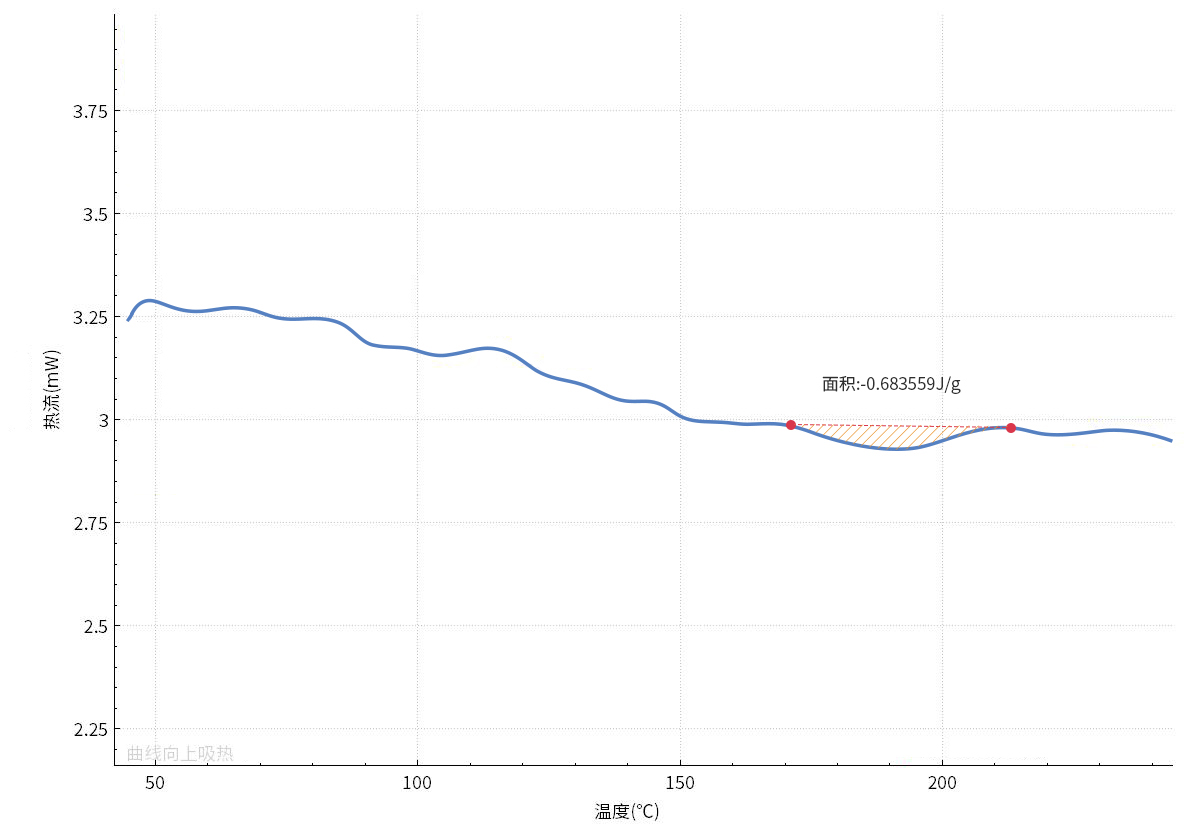 測試結(jié)果表明,橡膠硫化過程的熱釋放效應(yīng)較為微弱,對測試儀器的靈敏度與分辨率等核心性能指標(biāo)提出了更高要求。在此研究中,DSC-40A憑借其卓越的微弱信號檢測能力,成功捕捉到低至0.6836 J/g的微小放熱信號。通過其配套專用分析軟件,可清晰解析該微弱放熱過程的關(guān)鍵參數(shù),如熱焓值(詳見圖3),實現(xiàn)了對硫化反應(yīng)的精確表征,這一結(jié)果有力印證了DSC-40A的高性能表現(xiàn)。